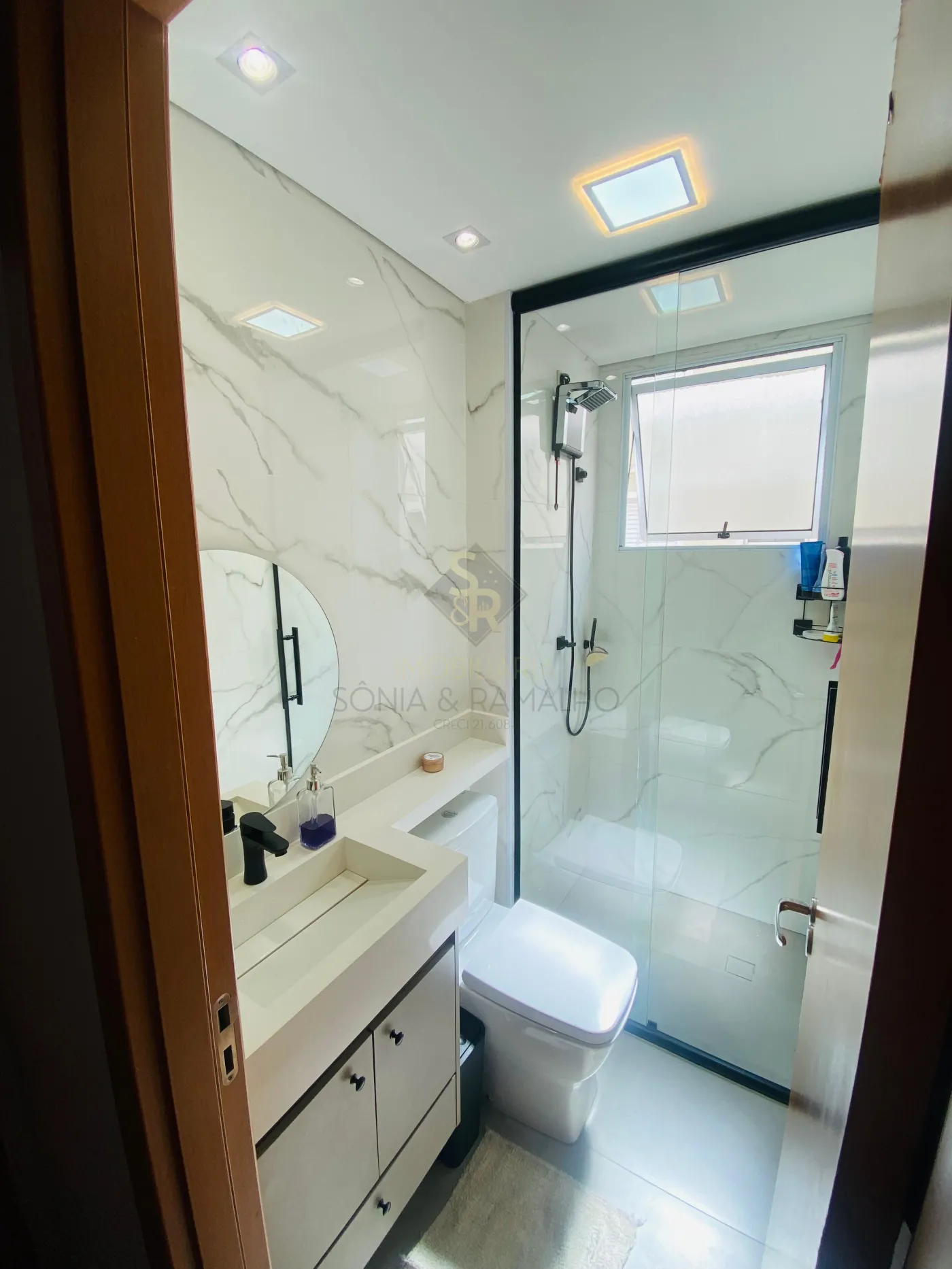 - Lavabo do banheiro em quartzo (armário na parte superior).