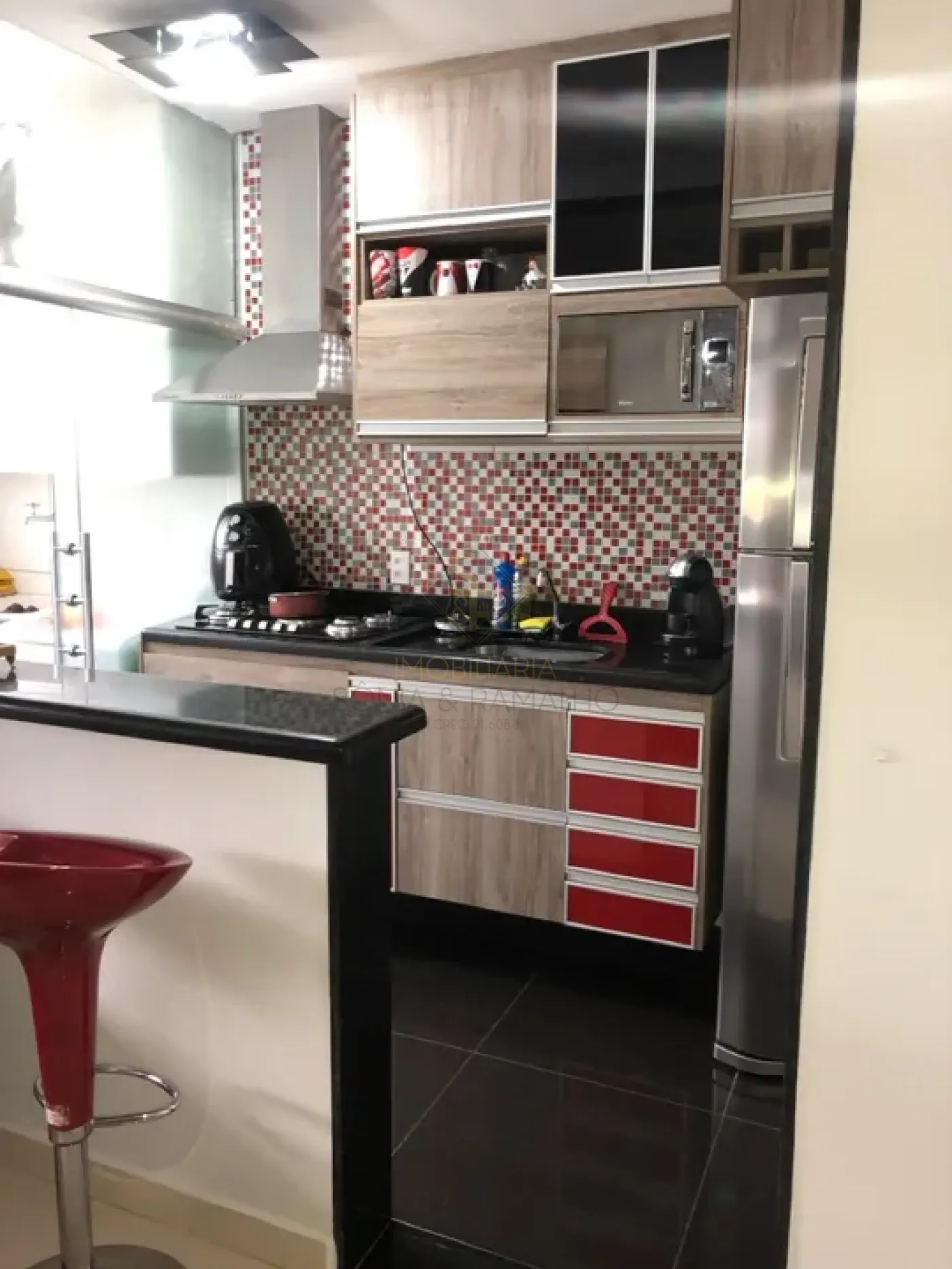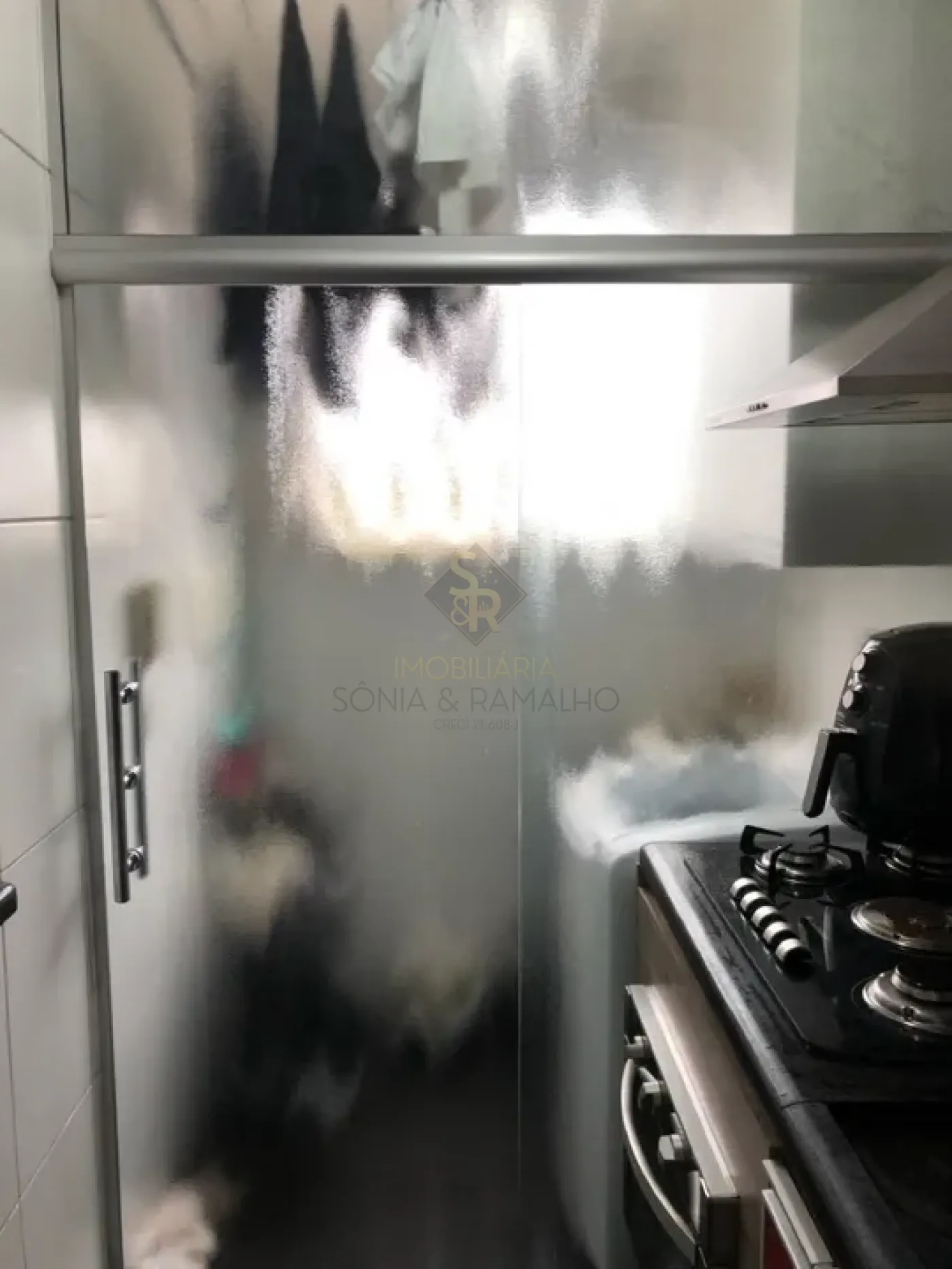 - Cozinha rica em armários e porta de correr de vidro temperado até o teto, separando a cozinha da área de serviço