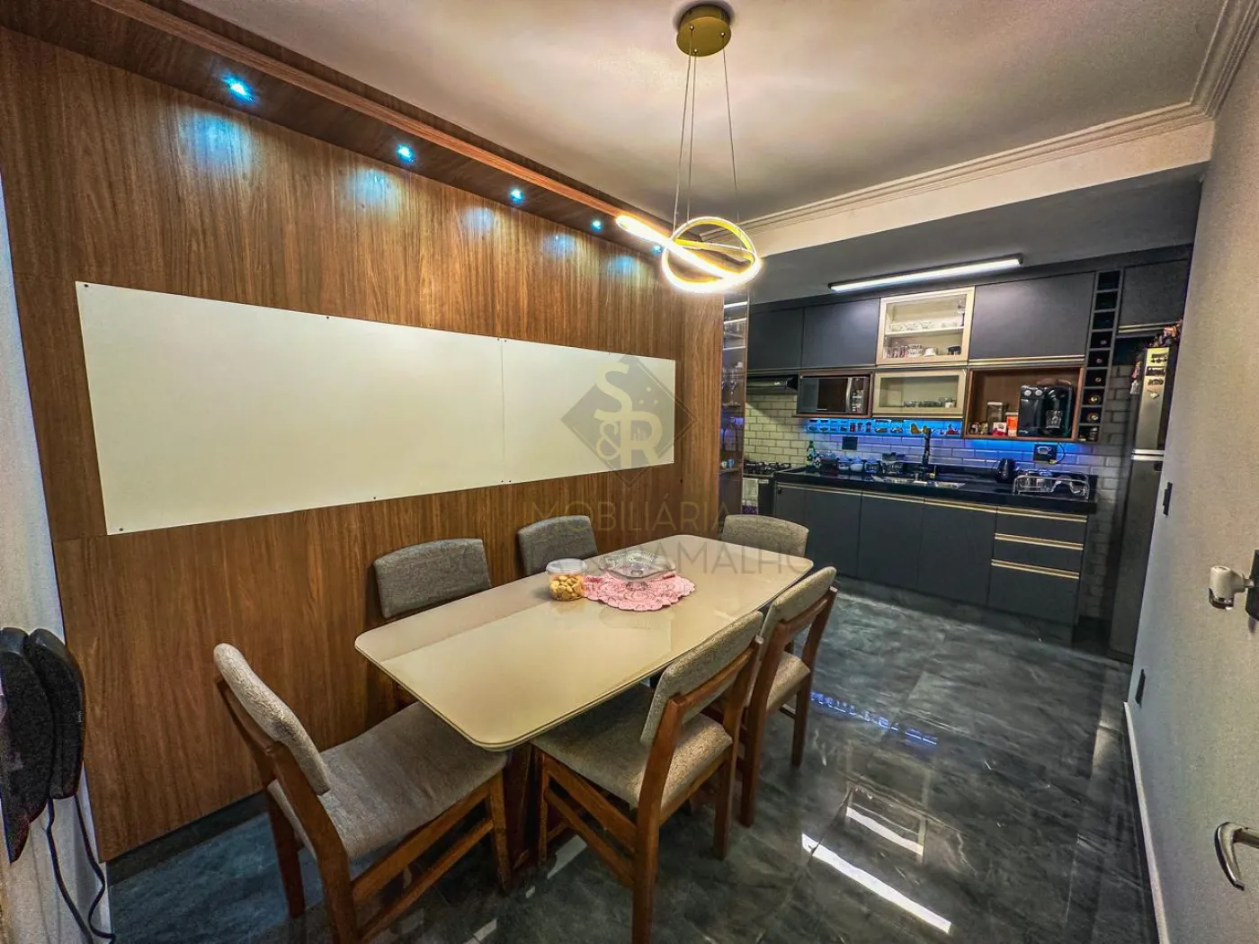 - Sala de jantar com cristaleira e planejado com iluminação em LED.