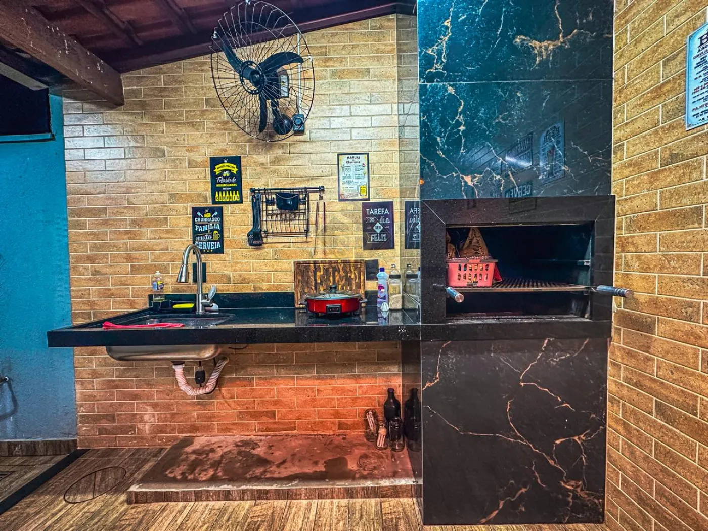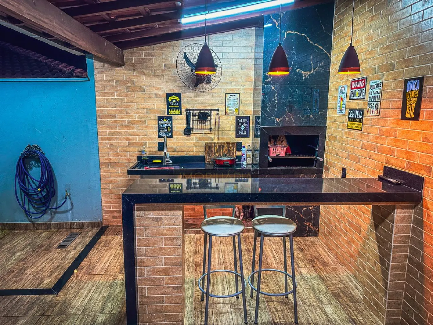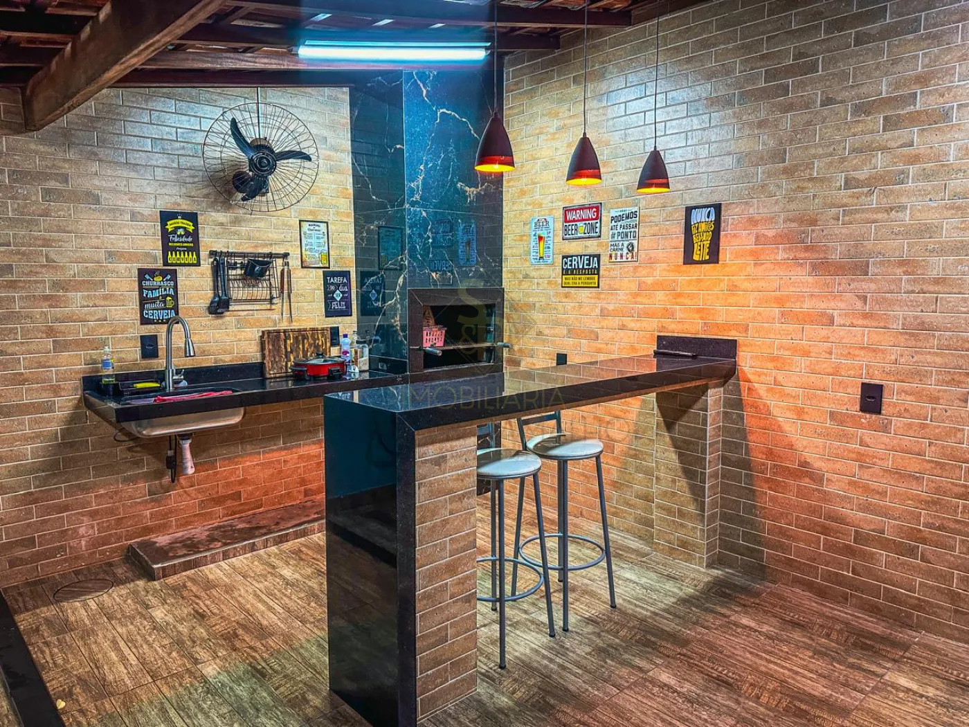 - Área de churrasco com churrasqueira revestida em porcelanato e iluminações.