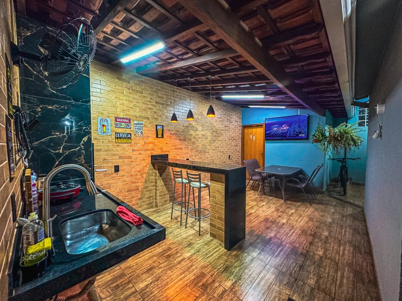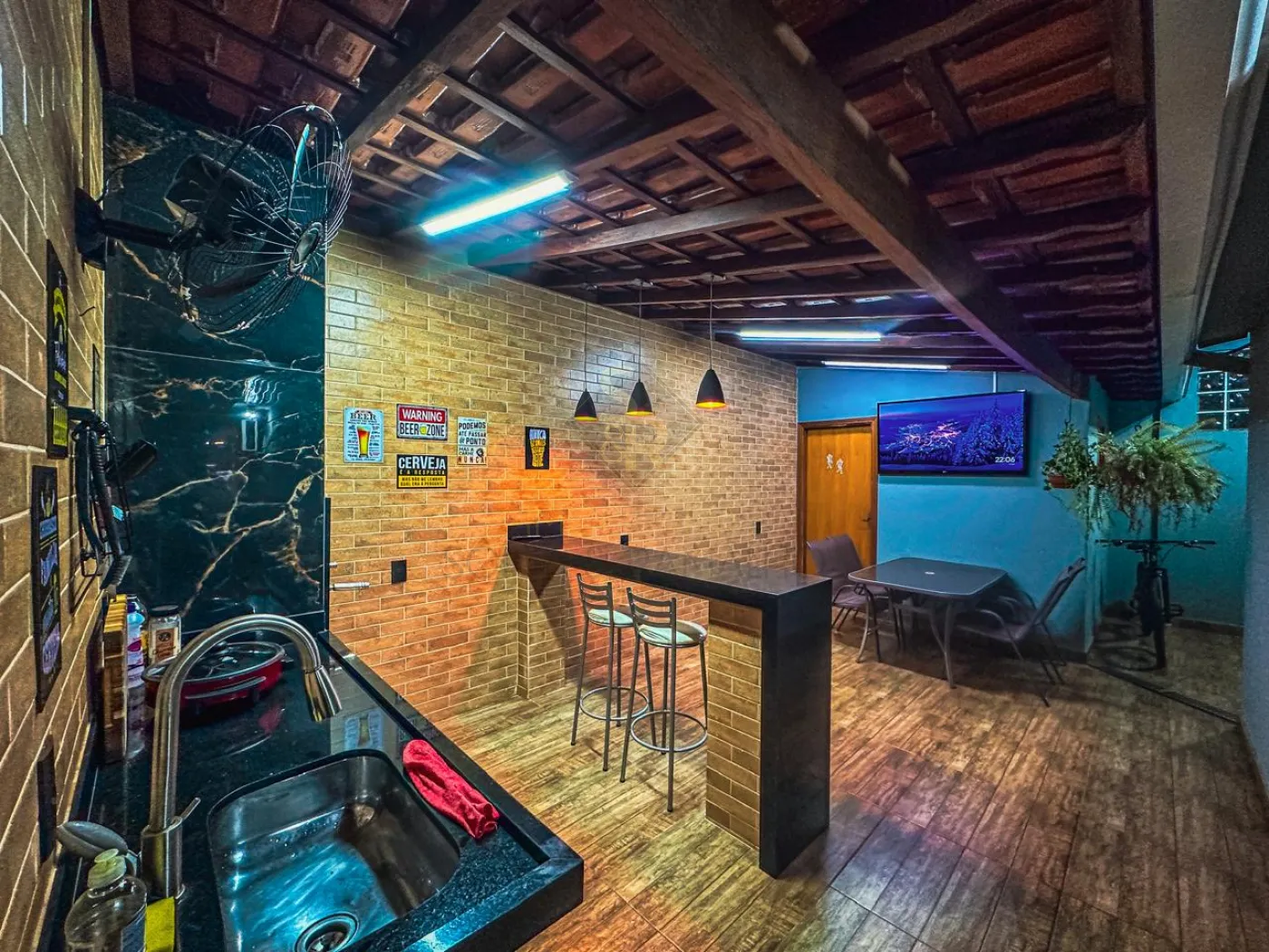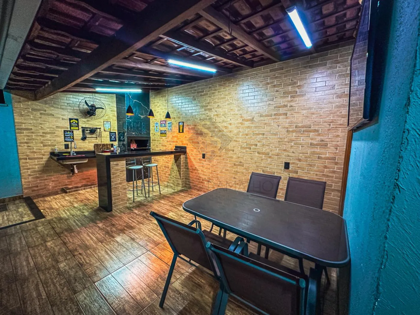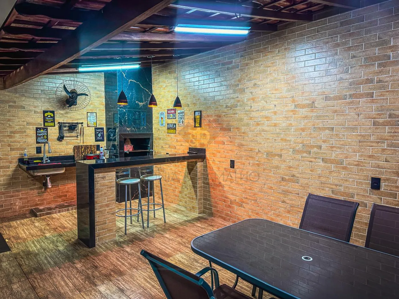 - Área de churrasco com churrasqueira revestida em porcelanato e iluminações.