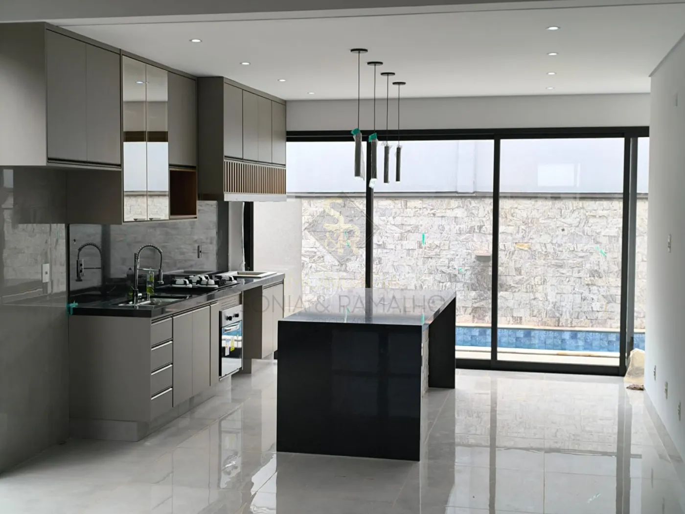 - Cozinha planejada e equipada com cooktop, forno e ilha