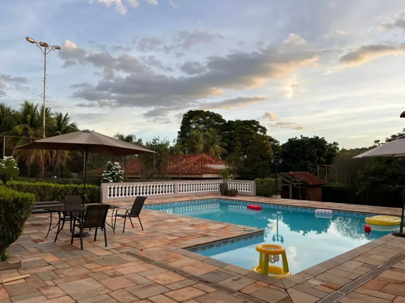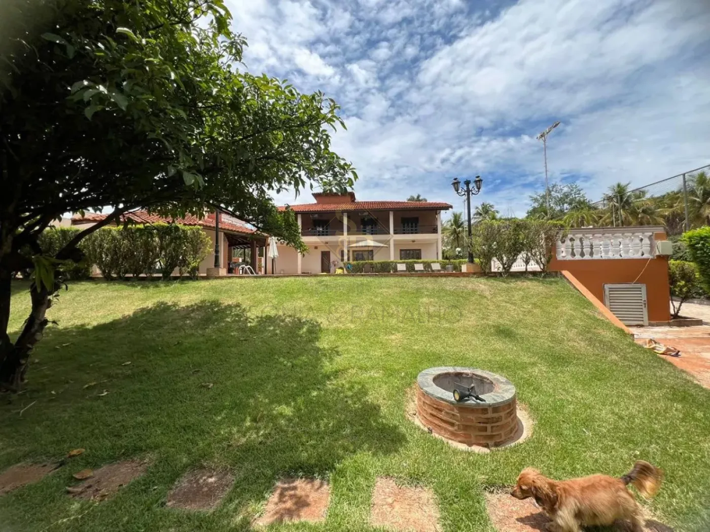 - Pomar com árvores frutíferas, galinheiros e baias para cavalos