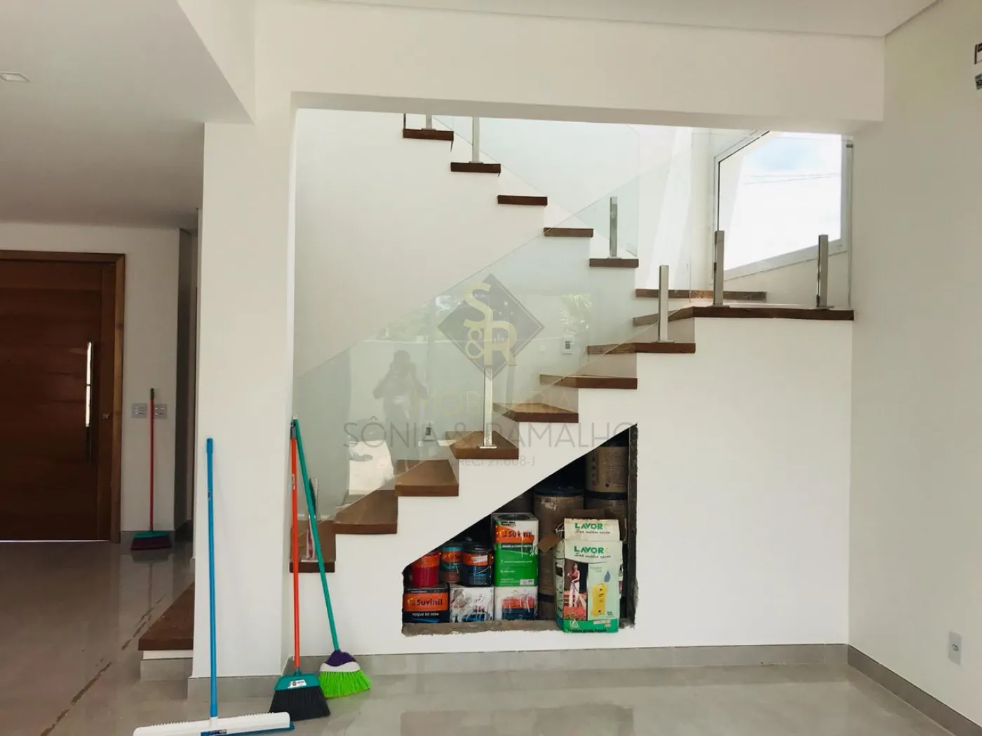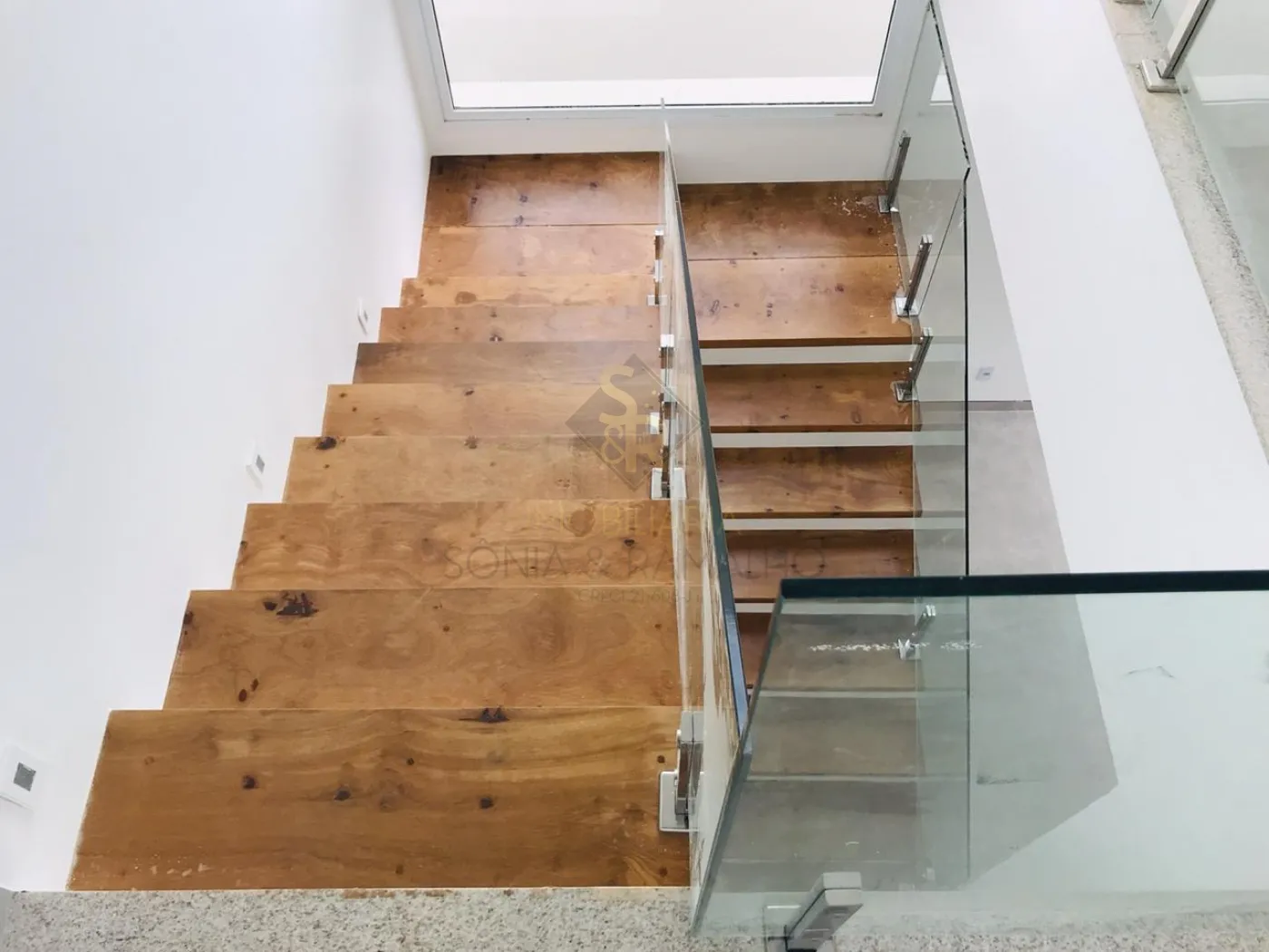 - Escada em madeira nobre (pequi preto) com guarda-corpo em vidro temperado