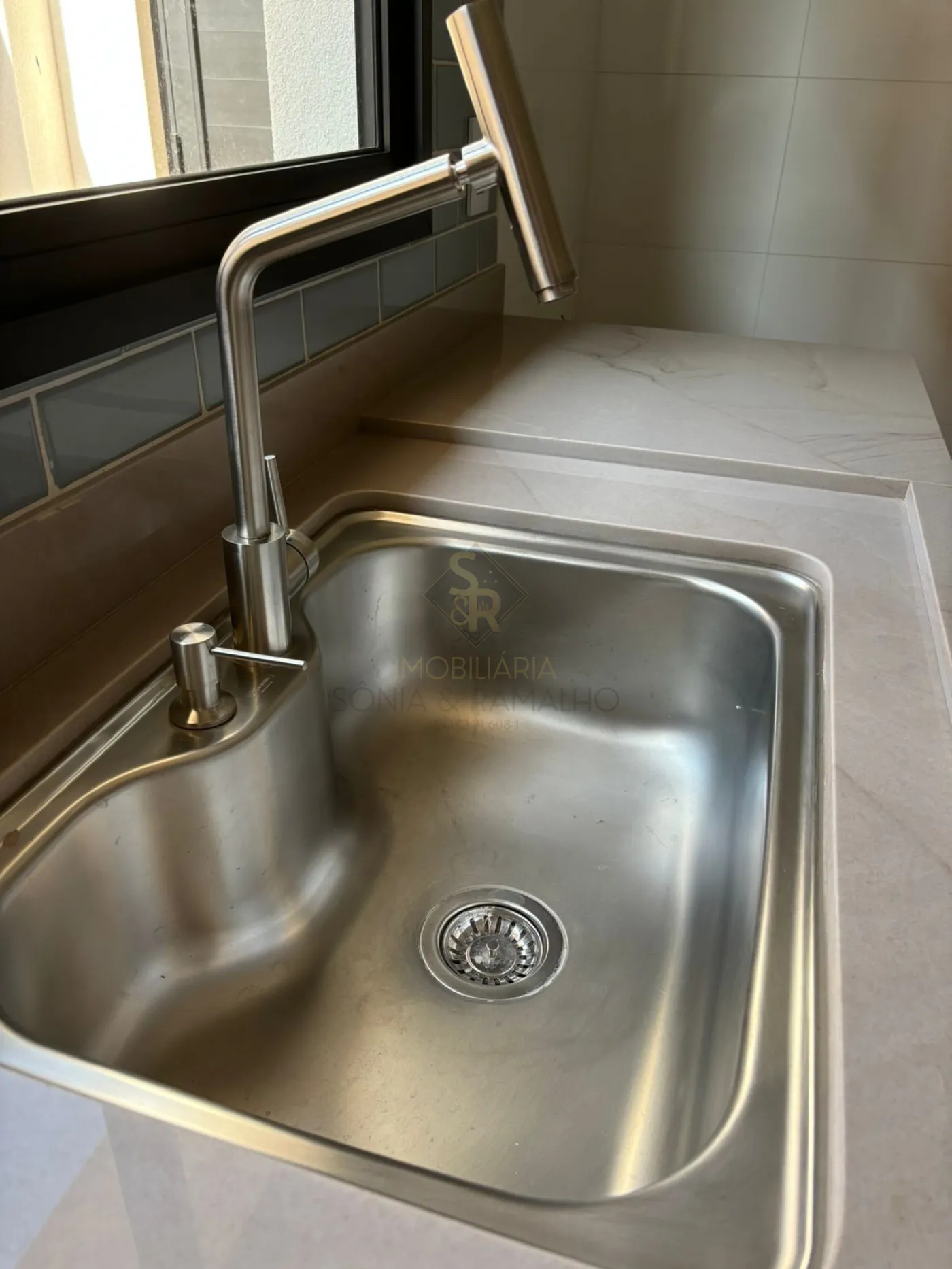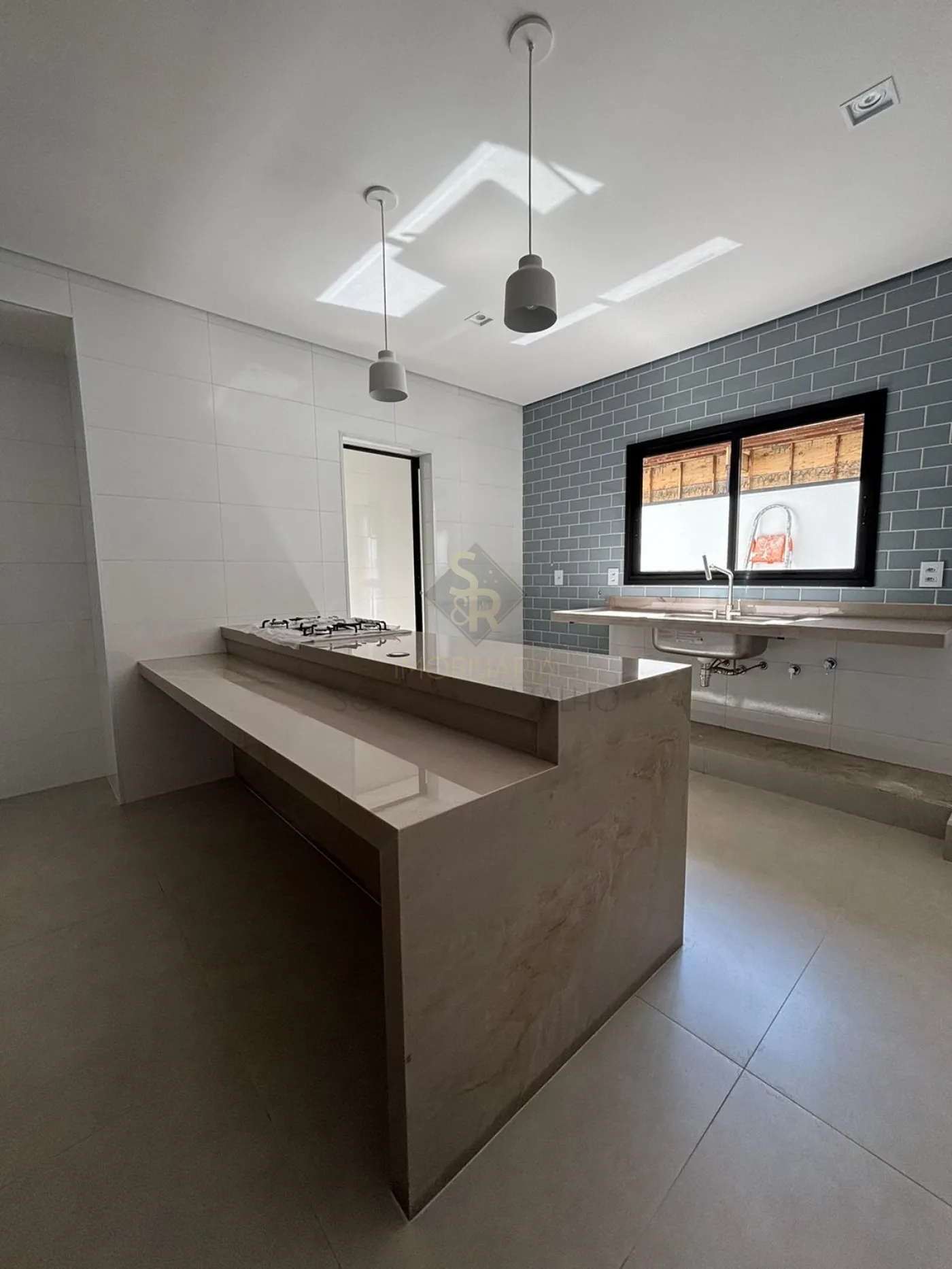 - Bancadas da cozinha e área gourmet, ilha da cozinha, soleiras e pingadeiras em quartzito Kalahari. Pronta para lava-louça.
