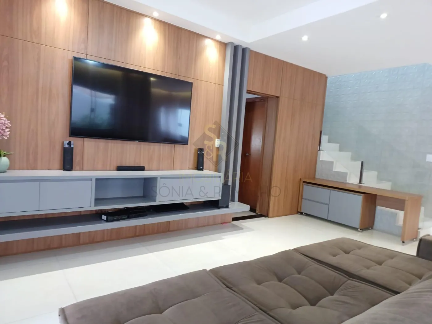 - Sala de TV ampla integrada à sala de jantar, painel feito sob medida em toda extensão da sala, iluminação em Led;