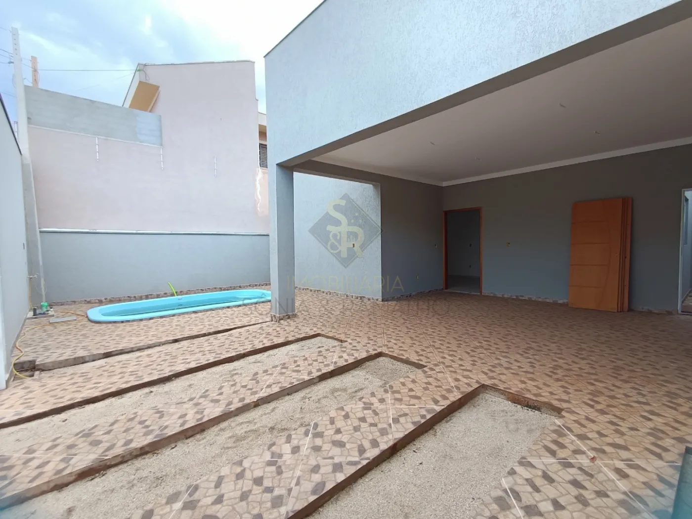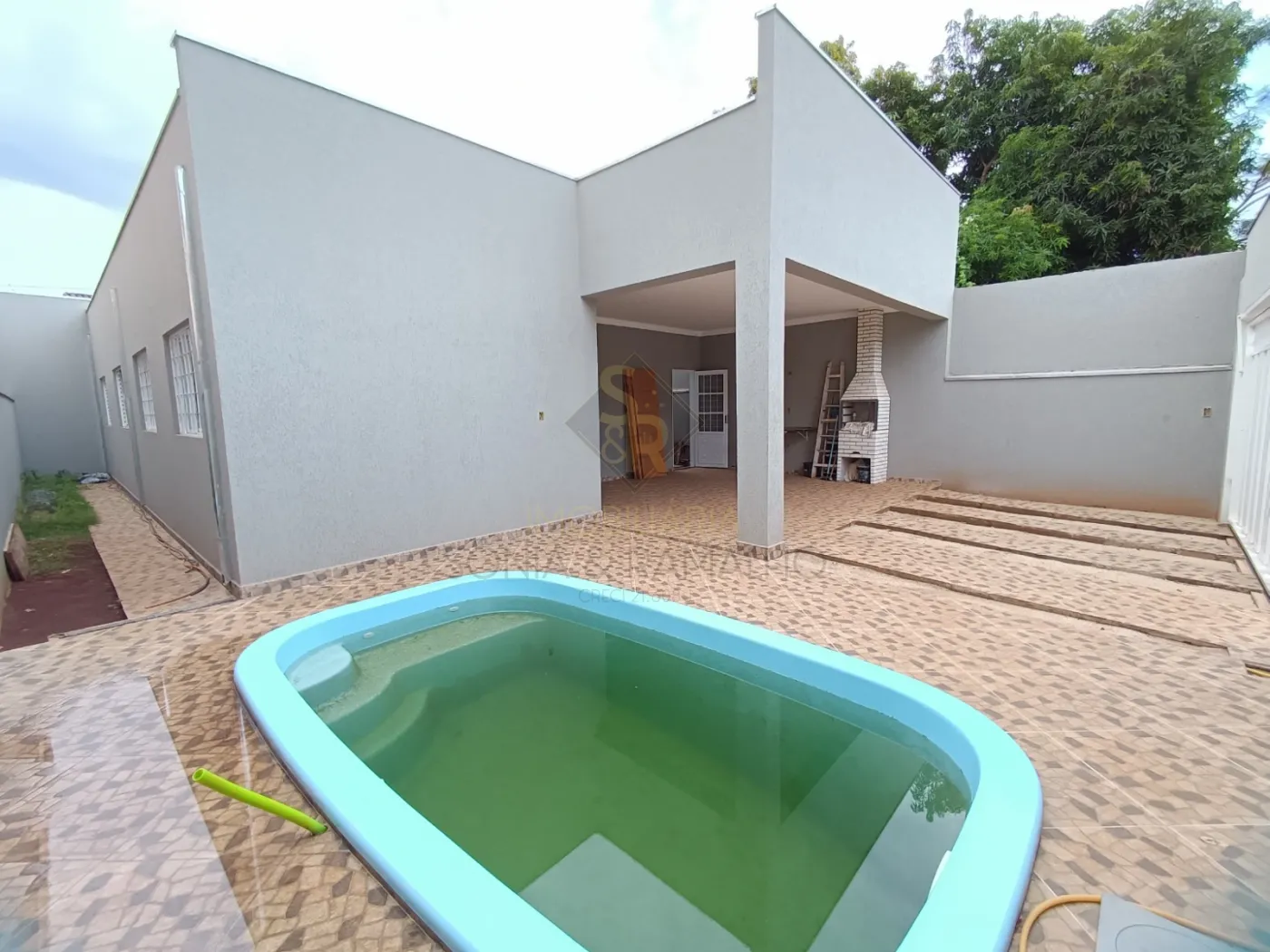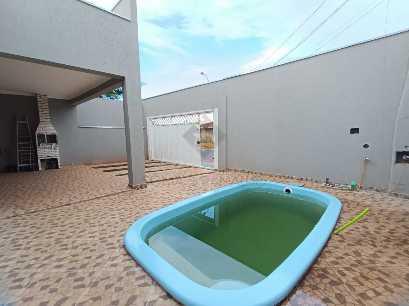 Piscina, grama no corredor.